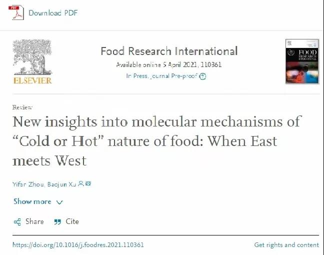 International在线出版论文《有关于食品寒热性的新见解:当东方遇见西方》,这也是周一帆第一次发表SCI论文。食品科学与工程专业课程主任徐宝军教授为论文通讯作者。