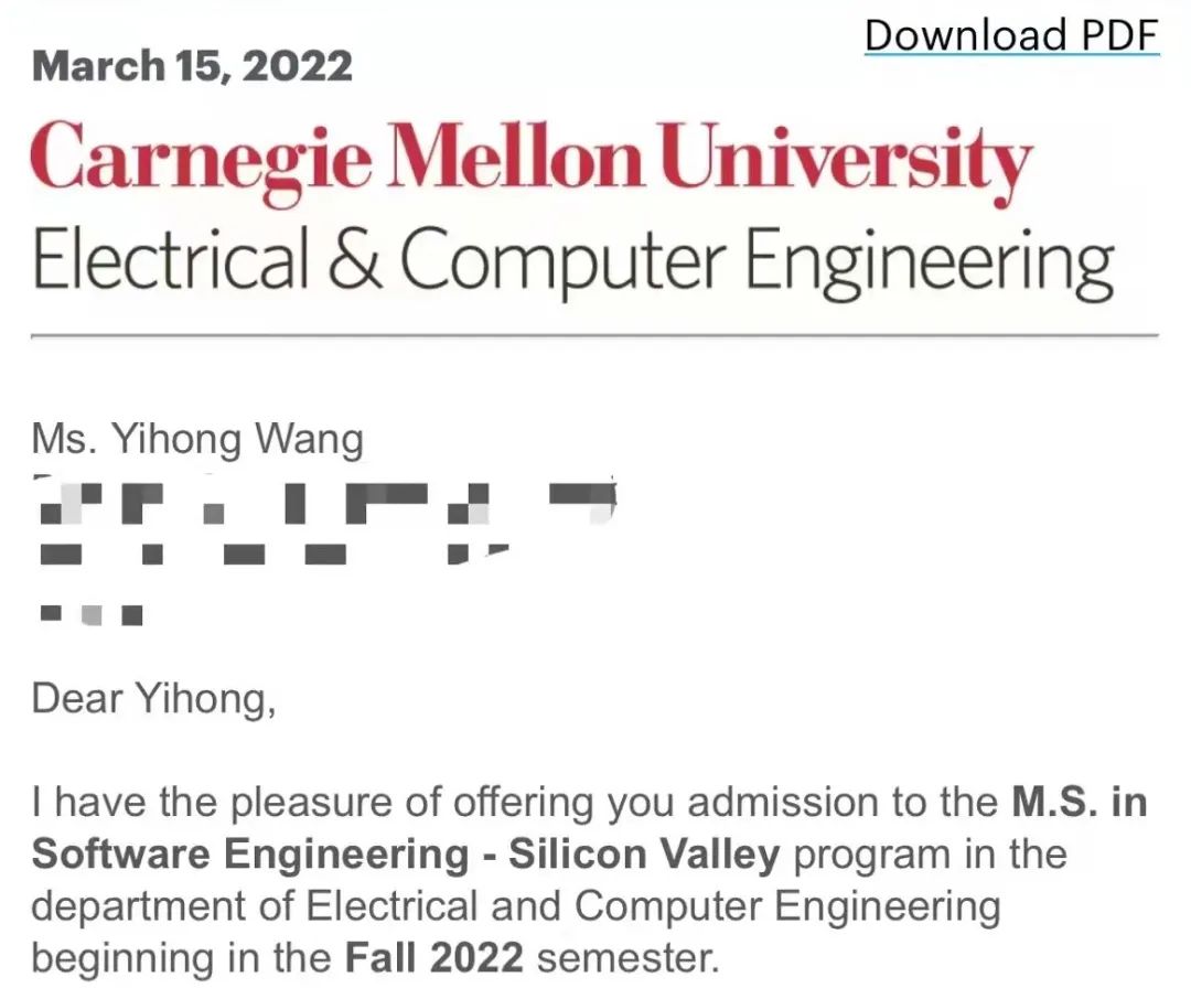 汪一泓获卡内基梅隆大学软件工程硕士专业录取