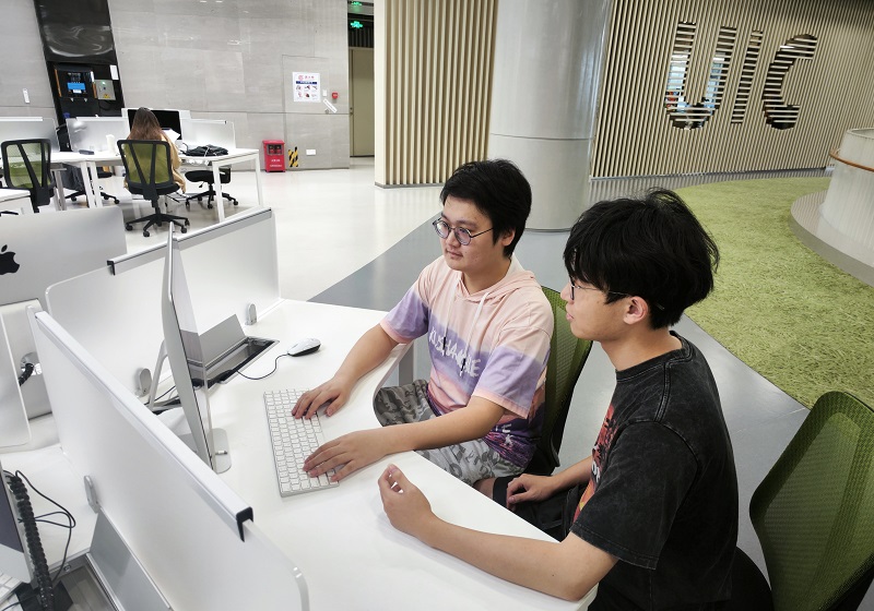 谭琪润(左)与同学进行项目讨论