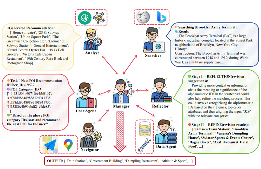 下一步的兴趣地点(POI)推荐旨在基于用户的历史轨迹预测其下一个位置,但现有方法(如协同过滤和基于神经网络的模型)在处理动态数据和轨迹数据较少的情况下表现不佳。为此,本文提出了一种新颖的多智能体系统 MAS4POI,通过利用专门化的智能体提升推荐性能。该系统包含七个智能体:管理者(Manager)、数据智能体(Data Agent)、分析智能体(Analyst)、导航智能体(Navigator)、检索智能体(Searcher)、用户智能体(User Agent)和反思智能体(Reflector)。管理者负责监督所有智能体,并根据系统状态和资源可用性分配任务。用户智能体管理用户信息,数据智能体将用户兴趣地点(POI)数据转化为历史轨迹。分析智能体结合用户历史轨迹、行为及兴趣地点之间的地理关系,提供个性化推荐。反思智能体负责通过迭代评估和优化推荐结果,纠正不准确的输出。检索智能体访问外部数据源,响应用户需求。最后,导航智能体根据用户的最终目的地进行路线规划,并生成静态地图。实验结果表明,MAS4POI 在多个实际应用数据集上达到了最先进的性能水平。