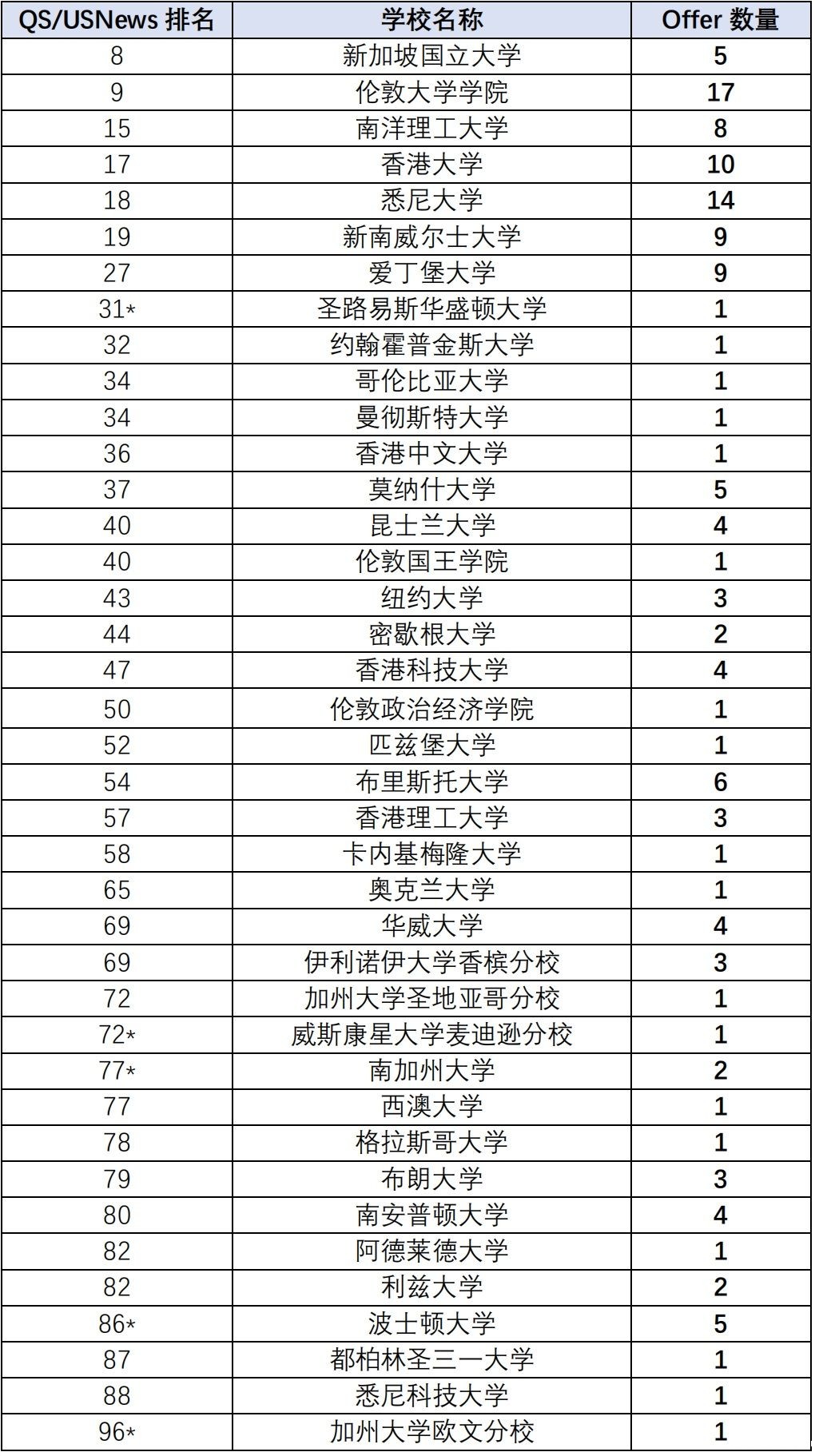 QS/US News前100高校录取情况
