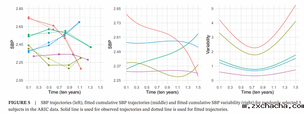 注释:左图展示了论文实证分析中随机抽取的五位患者的血压观测值与拟合值的折线图;