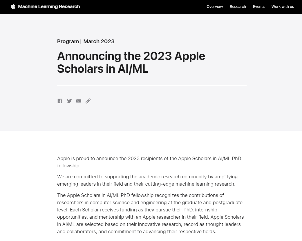 该项目支持和奖励计算机科学与工程领域极具潜力的博士研究生开展研究。奖学金的评判标准基于参选学生的创新研究、所在领域的学者或合作伙伴对他们的评价,以及他们在人工智能和机器学习领域所取得的成绩。今年的获奖者除了获得研究基金资助外,还将获得实习机会和来自相关领域苹果研究员的指导。