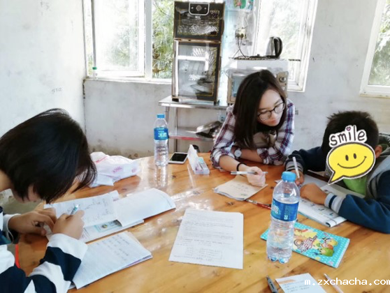 邓蕴僖(中)给外来务工人员子女辅导作业