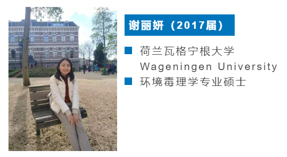 谢丽妍:瓦大每年吸引了来自全球的学生,它位于荷兰的中部,环境也十分适合读书,常伴你周围的是大片牧场与森林。荷兰的学制和国内不一样,瓦大一年有6个学期,每学期修1-2门不等,也就是学完一门再到下一门,短时间内专攻一门课印象也相对深刻。瓦大的环境毒理学专业研究方向很多,可以去到再决定自己的研究方向。