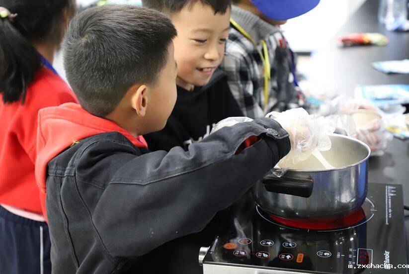 接下来便是小朋友动手实践。五人一组的小朋友们共同合作,使用事先准备好的材料完成了加热、搅拌及冷却的过程。现场氛围十分热烈,在学生志愿者的帮助下,制作有序地进行着。