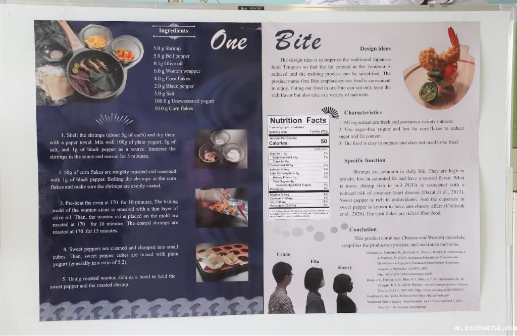 随着活动的火热进行,投票的结果也渐渐浮现。还记得活动预告里剧透的“瑰莉之夏”吗!经过老师们的几番斟酌,这组由张天宇、李润鑫、林昊秋制作的创新食品用它的清新淡雅和令人难忘的甜美,突破重围,成功俘获了多数评委的味蕾和芳心获得最受欢迎食品奖。由王颢晓、伍天行、卫栩进制作的“火山流心曲奇”被珠海雅富兴源食品工业有限公司余总监评选为最具商业价值奖。王鸣鹤、谭泳淇、胡馨雯制作的“一口虾肚”获得最佳海报奖。