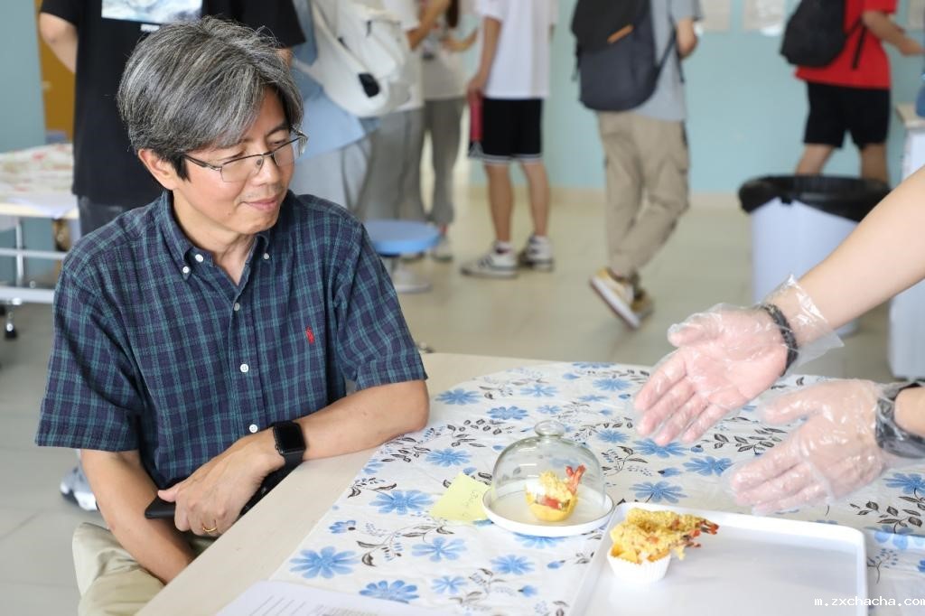 在充满香气的T8五楼, 师生们在品尝过后需对产品进行感官评价,写下他们对产品的感受和建议,而老师们可以为自己喜欢的创意食品投上一票。 现场的所有作品都给参与者们留下了深刻印象,理工科技学部院长黄华雄教授也沉浸在美食的世界中,被食品的魅力征服。