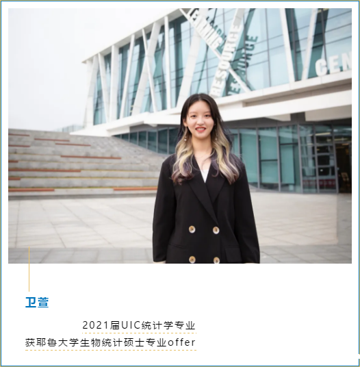 抱着“挑战试试”的心态,她申请了她的“梦校”——耶鲁大学的生物统计学专业,并被顺利录取。“除了‘幸运’,也许是从专业课程获得的这些项目经验让耶鲁大学看到了我在大学的成长与未来的规划。”