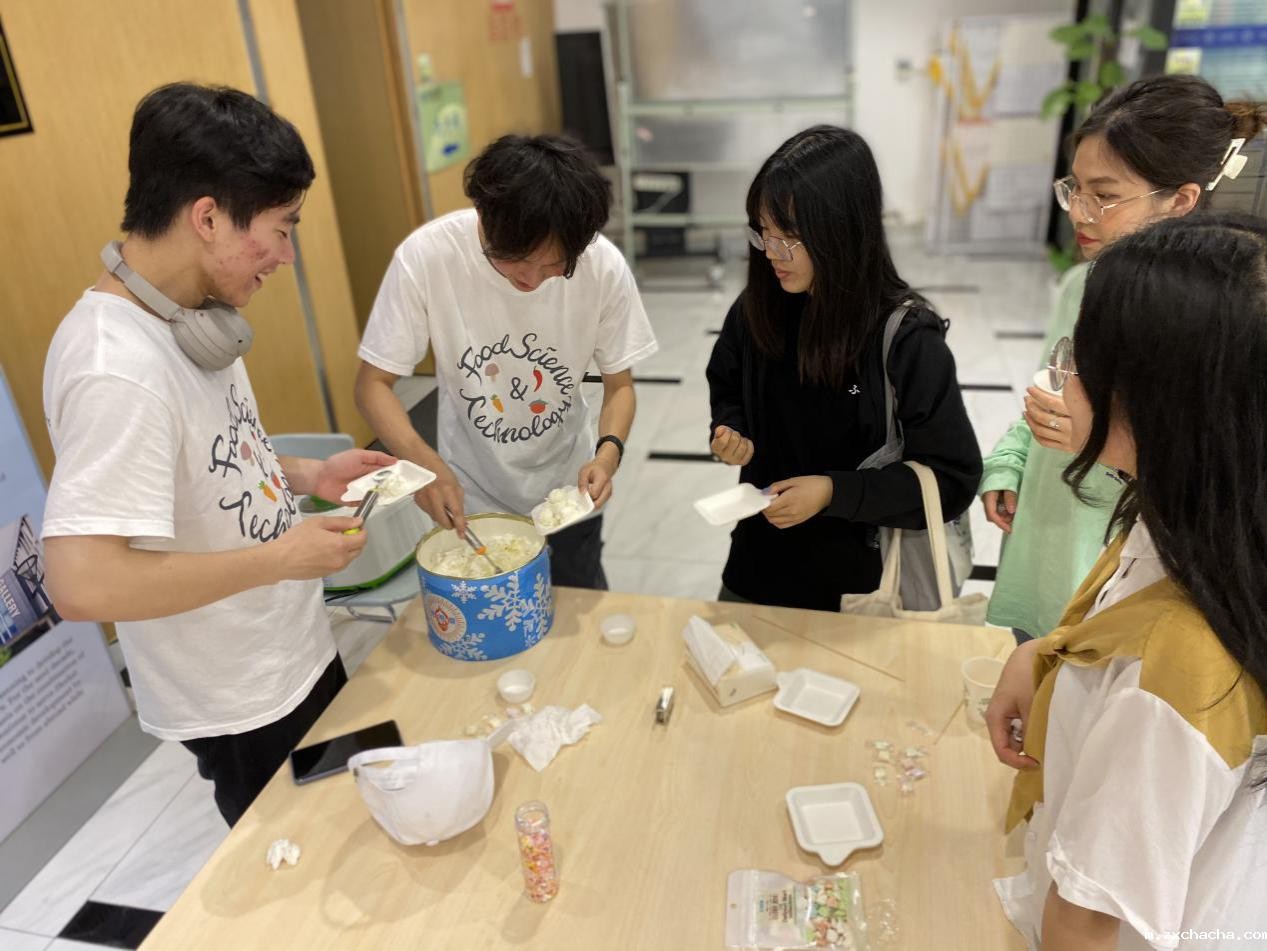 投掷乒乓球游戏的趣味性以及未知食材的“神秘感”,成功吸引不少同学参与。在这轮活动中,乒乓球投入不同纸杯可获得不同食材,参与者可以用得到的食材一起搭配巧克力食用。山楂蘸巧克力你或许听说过,但是甜椒蘸巧克力,西芹蘸巧克力你敢尝试一下吗?“醉翁之意不在酒,在乎山水之间也”,同学们的乐趣不在于获取了什么食物,而是沉浸于游戏的过程。