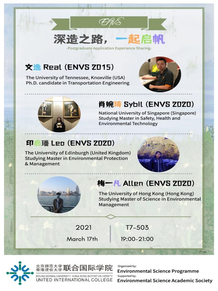 分享会当晚,环境科学专业邀请了来自香港大学环境管理科学专业研究生梅一凡,爱丁堡大学环境保护与管理专业研究生印启璠,新加坡国立大学安全、健康与环境技术专业研究生肖婉琦,以及加州大学圣塔芭芭拉分校硕士毕业,田纳西大学诺克斯维尔分校可持续交通专业博士生文逸共四位优秀环科毕业生进行分享。