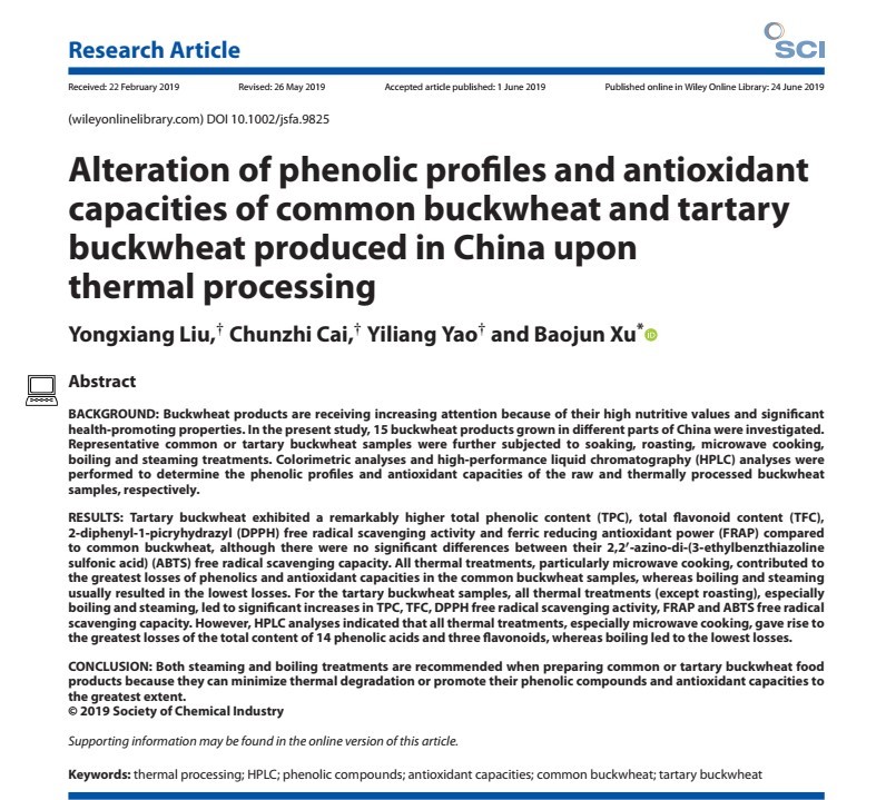 该成果于2019年9月发表于国际学术期刊Journal of the Science of Food and Agriculture,多次被国内外学者引用。研究结果表明,较之于普通荞麦,苦荞麦拥有显著性高的多酚类、黄酮类化合物和抗氧化活性。蒸或煮加工可显著提升苦荞麦的多酚类和黄酮类化合物和抗氧化活性。较之焙烧和微波热加工,蒸或煮加工可以有效保留或增加部分活性成分,因而被推荐为食品工业加工模式或家庭消费方式。