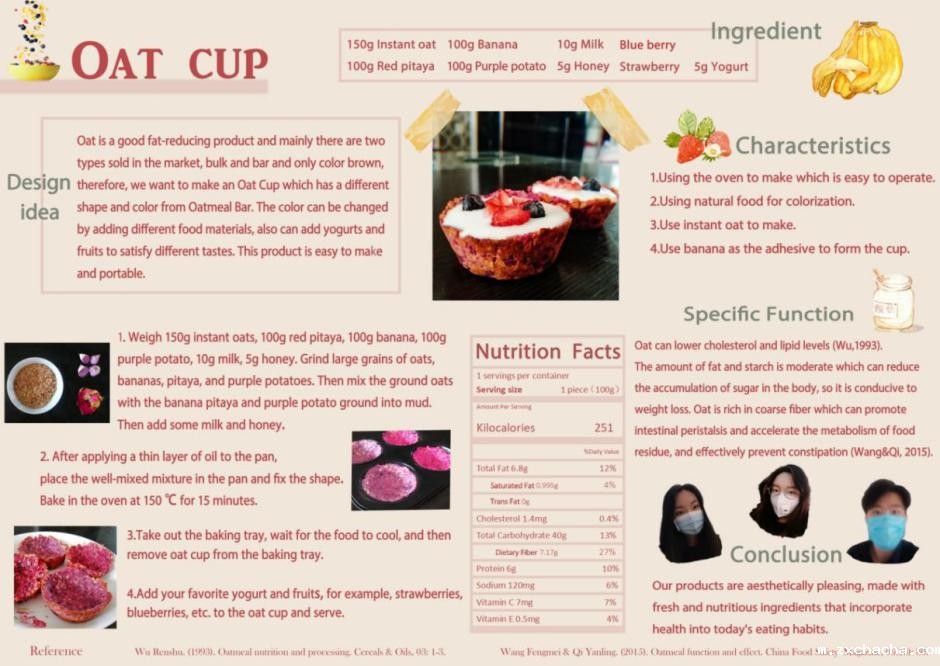 使用膳食纤维丰富的即食燕麦作为主要材料,再与搅碎的香蕉与火龙果混匀,最后放入烘箱中烘烤半小时左右,一个营养丰富又低脂的燕麦杯底便做好了。将维他命含量丰富的草莓、蓝莓与风味独特的希腊酸奶加在一起,便制成了促进消化的奶盖。该产品制作过程简单,但营养含量丰富。大量的可以促进肠胃蠕动,多种多样的水果可以提供人体所需的各种维他命。其他快餐产品可能含有大量油脂,不易消化且营养成分单一,但“燕麦杯”低胆固醇以及低饱和脂肪酸的营养结构,使食客完全不用担心身材走样。“燕麦杯”还含有足够的碳水化合物,可以提供人体日常所需的能量。该产品不失为一款创意独特的产品。
