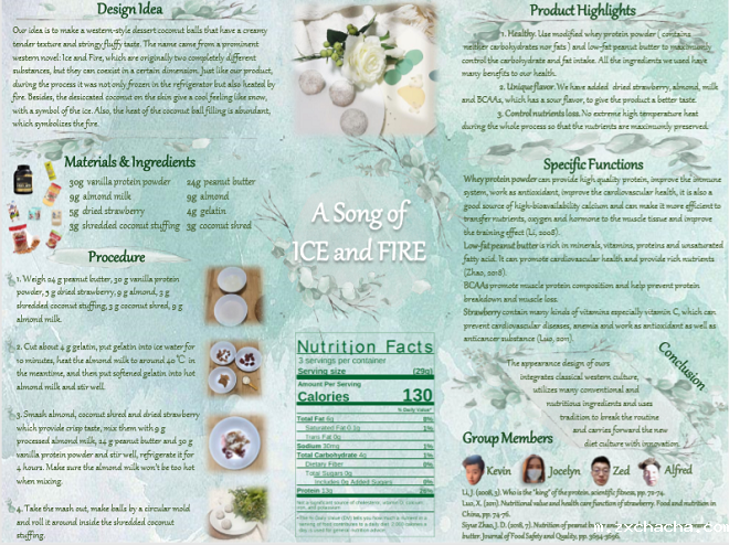 健身有时候是索然无味的,这款椰子球的设计理念基于健身爱好者的角度。椰子球中融入健身补充剂,让无味的健身补充剂变成好吃的能量椰子球,并起名为冰与火之歌,因为椰子球制作过程中包含冷冻和加热等步骤,并且椰子球馅料热量高。