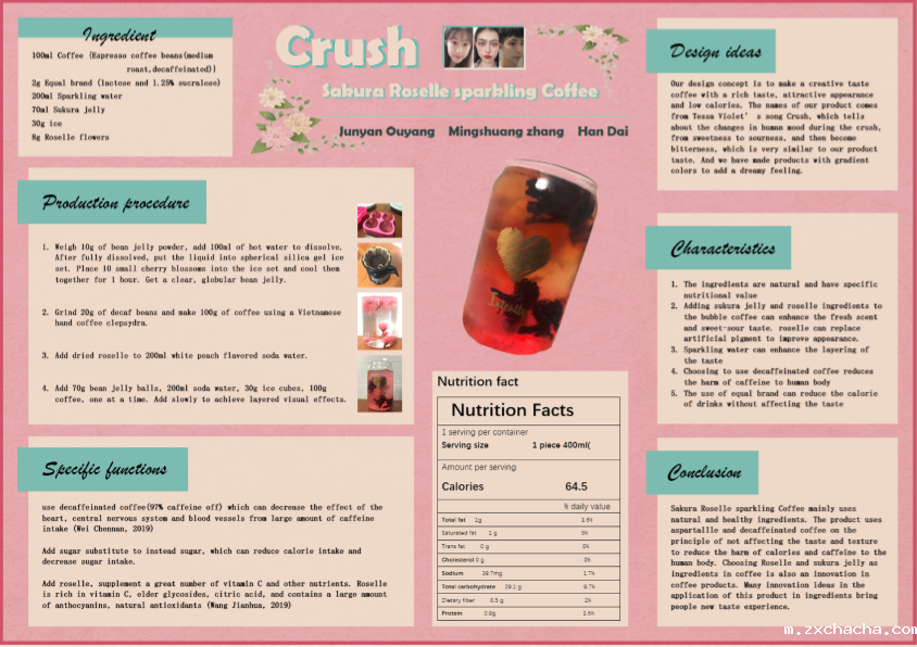 产品名Crush来源于Tessa的歌曲《Crush》,它讲述了心动过程中人的情绪变化,从甜味到酸味再到苦味,产品的口味也以此为灵感。苏打水与苏打水的混合物产生淡淡的甜味,然后再是洛神花产生的微酸,最后便可以品尝到咖啡带来的苦味。与此同时产品具有渐变色,增添了梦幻般的感觉。为了制作出具有浓郁口感,诱人外观和低热量的创意咖啡,产品含有许多天然物质——樱花果冻和洛神花均是对人体有益的天然植物元素。食用洛神花可以减轻体重和降低血压,食用樱花果冻可以调理皮肤和缓解疲劳。就产品外观与口感方面,红色的洛神花可以增添色泽,樱花可以增加甜酸味和香气。