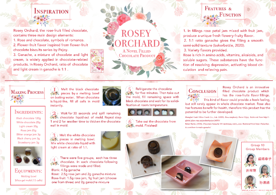 特殊时期,即使不能返校,同学们对课程学习的热情丝毫没有减少,仍然在家中研发出各式各样的创新食品。从“TAKOTACO-AVOCACO”到“芝芝青团”再到“玫瑰果园”无一不表现出同学们非凡的创造力。来自11个小组的作品各有特色,诚意十足,既有零食甜点、奶茶饮品、还有小食前菜,虽不能亲自到场品尝,但是精美的产品图一定可以打破距离的限制,隔着屏幕就能感受到美味的食品,也感受到食品科学的魅力。
