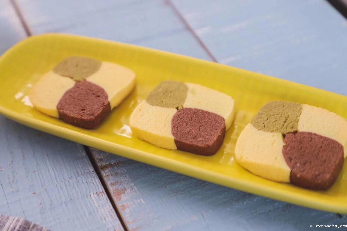 先将黄油软化,加入糖用打蛋器打发到颜色发白的状态,分三次倒入60g鸡蛋液。剩余的鸡蛋液,留着做粘合剂。每次倒入鸡蛋液,都要用打蛋器打匀,看不到鸡蛋液为止。再加入250g低筋面粉,搅匀后捏成面团,分成四份,搓成长条。其中两份分别加入可可粉、抹茶粉并均匀混合,把四份长条面团叠在一起并压整齐。包裹上保鲜膜后,放入冰箱冷冻2-3 小时。切成小方块状,再放入120℃的烤箱内烤制20分钟。该产品的配色与口感都会是市场上不可多得的。