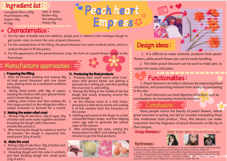 本产品为了突出桃花的功效特点,使用桃花果酱为原料,桃花果酱相对于桃花更加美味且易于处理。所以含糖和蜂蜜的桃花被充分脱水,用来制作成糕点内部的果酱。需要注意的是,由于桃花具有活血的作用,本产品不建议孕妇服用。
