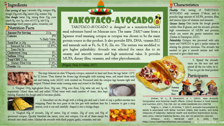 TAKOTACO AVOCADO,名字的创意来源于日语中的“ Tako”-章鱼,而“Taco”是源自墨西哥的小吃。Avocado则是鳄梨的英文,鳄梨是产品的核心之一。整个产品可以代替健康的膳食,每份的热量却只有273 kcal。