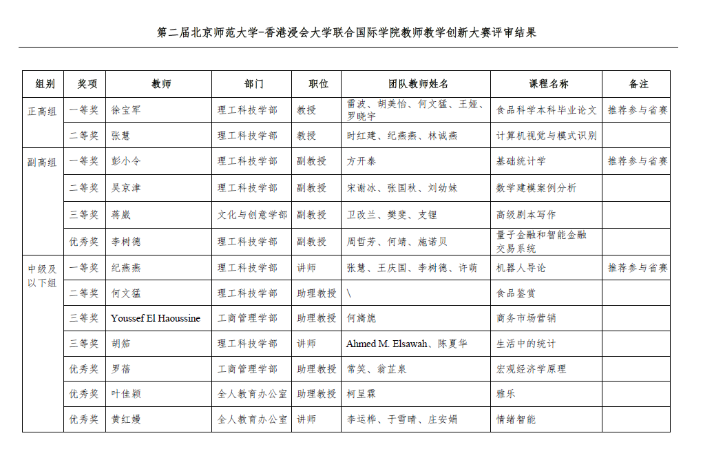第二届北京师范大学-香港浸会大学联合国际学院教师教学创新大赛获奖总名单