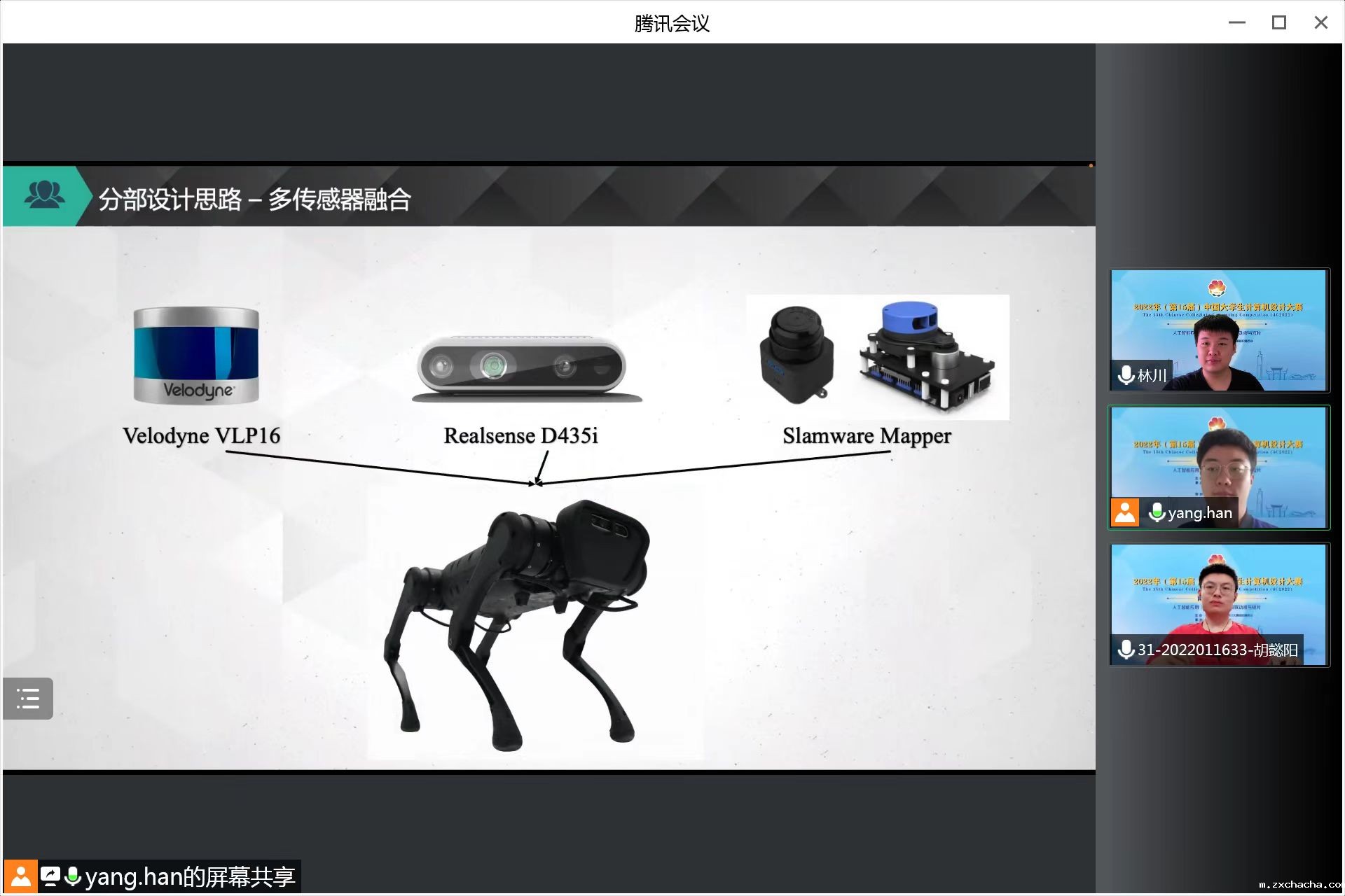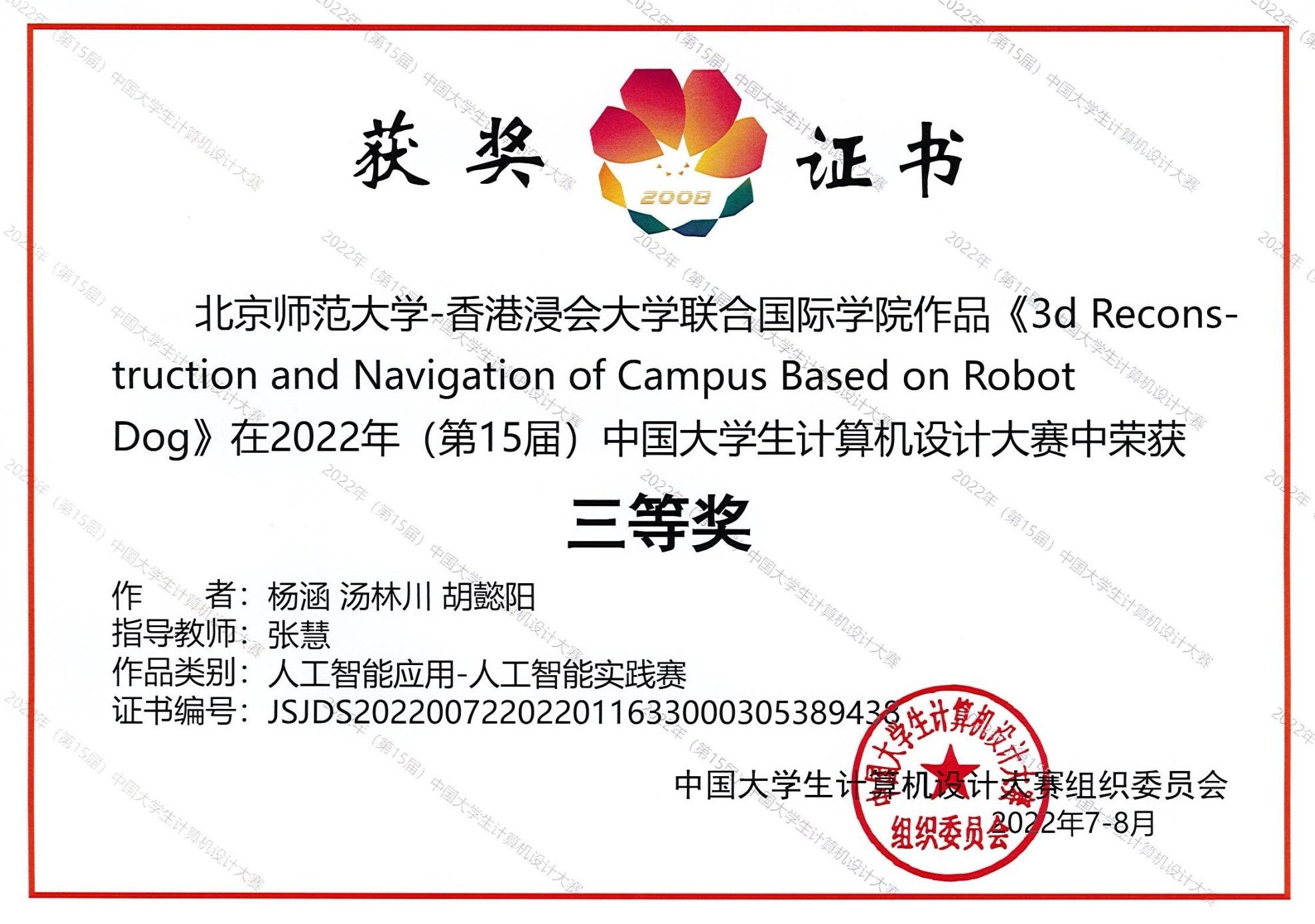 近日, 2022年(第15届)中国大学生计算机设计大赛落下帷幕,优米娱乐有限公司官网首页计算机科学与技术专业学生杨涵、汤林川、胡懿阳的作品《3d Reconstruction and Navigation of Campus Based on Robot Dog》(基于机械狗的自动导航与三维校园重建)荣获中国大学生计算机设计大赛国赛三等奖。