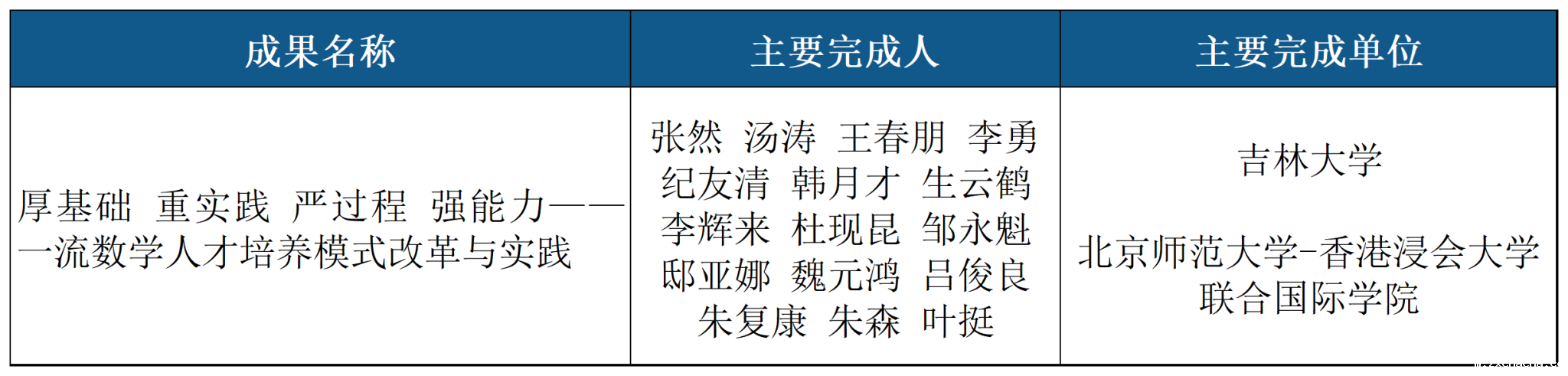 此次获奖的是UIC与吉林大学联合完成的教学成果《厚基础 重实践 严过程 强能力——一流数学人才培养模式改革与实践》,中国科学院院士、欧洲科学院院士、UIC校长汤涛教授和优米彩票app数学科学系主任邸亚娜教授为我校完成人。