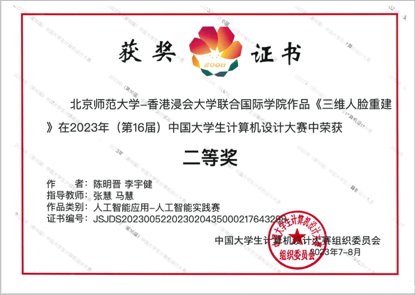 近日,2023年(第16届)中国大学生计算机设计大赛落下帷幕,优米娱乐有限公司官网首页计算机科学系学生陈明晋、李宇健的作品《三维人脸重建》荣获中国大学生计算机设计大赛国赛二等奖。