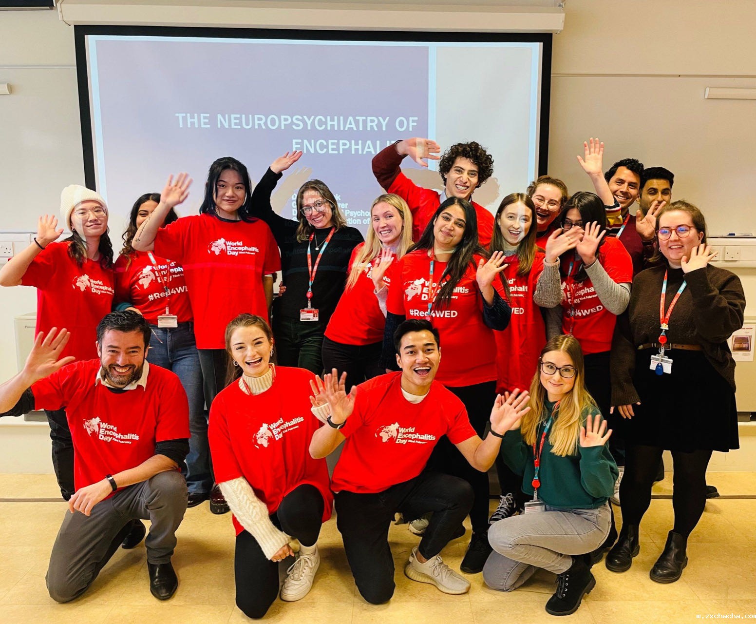 邓蕴僖(后排左一)与伦敦国王学院的老师、同学参加世界脑炎日的活动