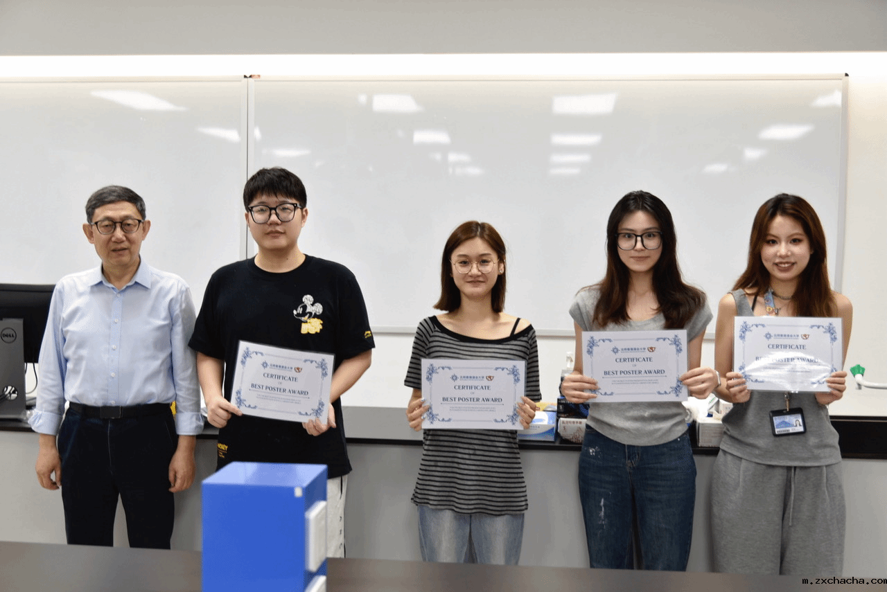 罗晓宇博士(左一)为”柚事早芭”制作组(郑嘉萱、孔晖珏、张璟瑜、邱馨苇、杜奂霖)颁发“最受欢迎奖”