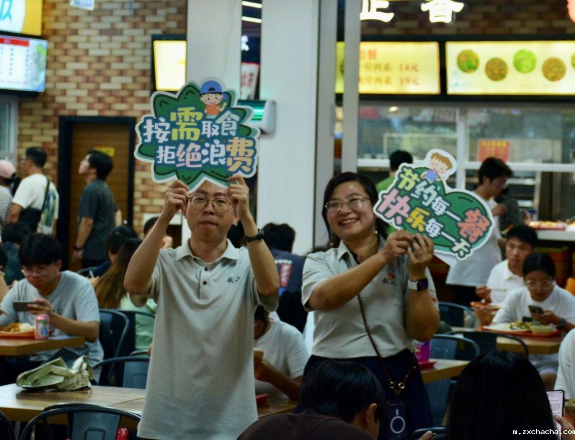 活动伊始,琢乐汇餐厅内响起了粮食节约主题广播。广播讲述了粮食从田间到餐桌的艰辛历程,呼吁大家珍惜每一粒粮食,杜绝浪费。内容不仅传递了传统节俭美德,也倡导了现代文明用餐理念,引发在场师生的共鸣。与此同时,现场师生手举“按需取食,节约浪费”“节约每一餐,快乐每一天”“光盘行动,拒绝浪费”等标语,形成了一道亮丽的宣传风景线。