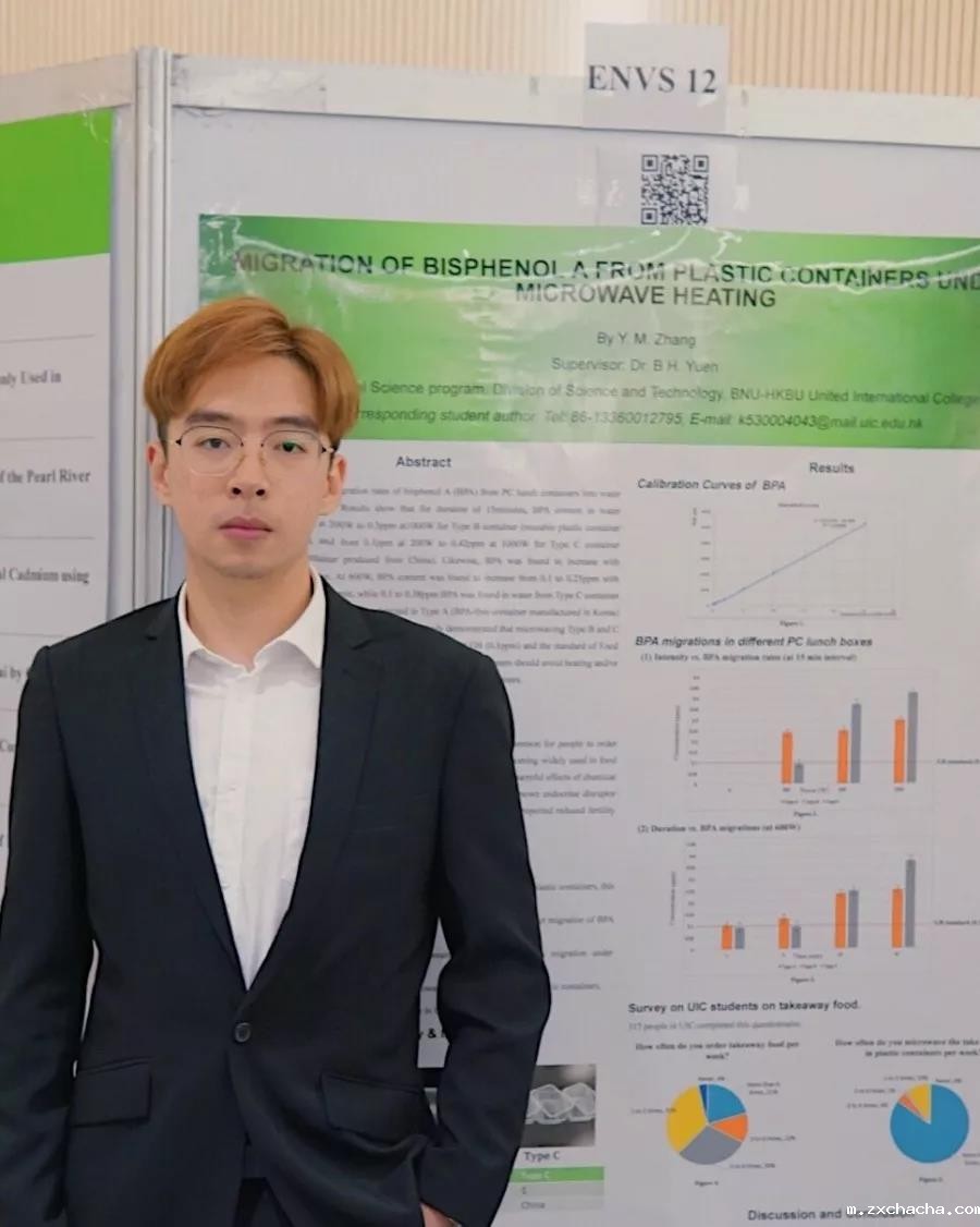 2015级环境科学专业张益铭同学研究的课题是“高温处理下双酚A在塑料容器中的迁移率”。因为张同学自己平时会点外卖,有时将外卖在微波炉中加热后会发现饭盒有变形等状况,于是构思出这个贴近日常生活的课题,对饭盒质量进行检验。