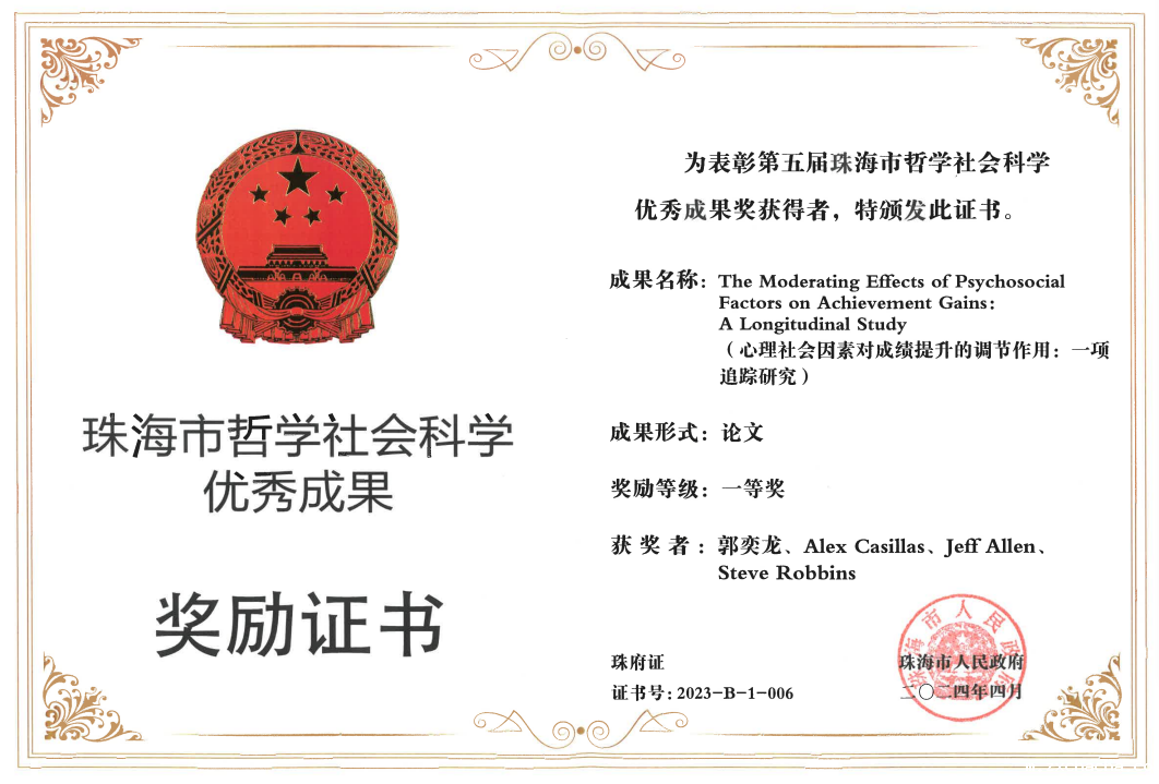 2024年4月22日,第五届珠海市哲学社会科学优秀成果政府奖颁奖大会在珠海度假村召开,展示近年来珠海哲学社会科学取得的丰硕成果。北京师范大学-香港浸会大学联合国际学院(简称优米娱乐有限公司官网首页,UIC)优米彩票app生命科学系应用心理学专业副教授、教师教学发展中心主任郭奕龙博士及其团队的论文《心理社会因素对成绩提升的调节作用:一项追踪研究》在本次评奖活动中荣获一等奖。