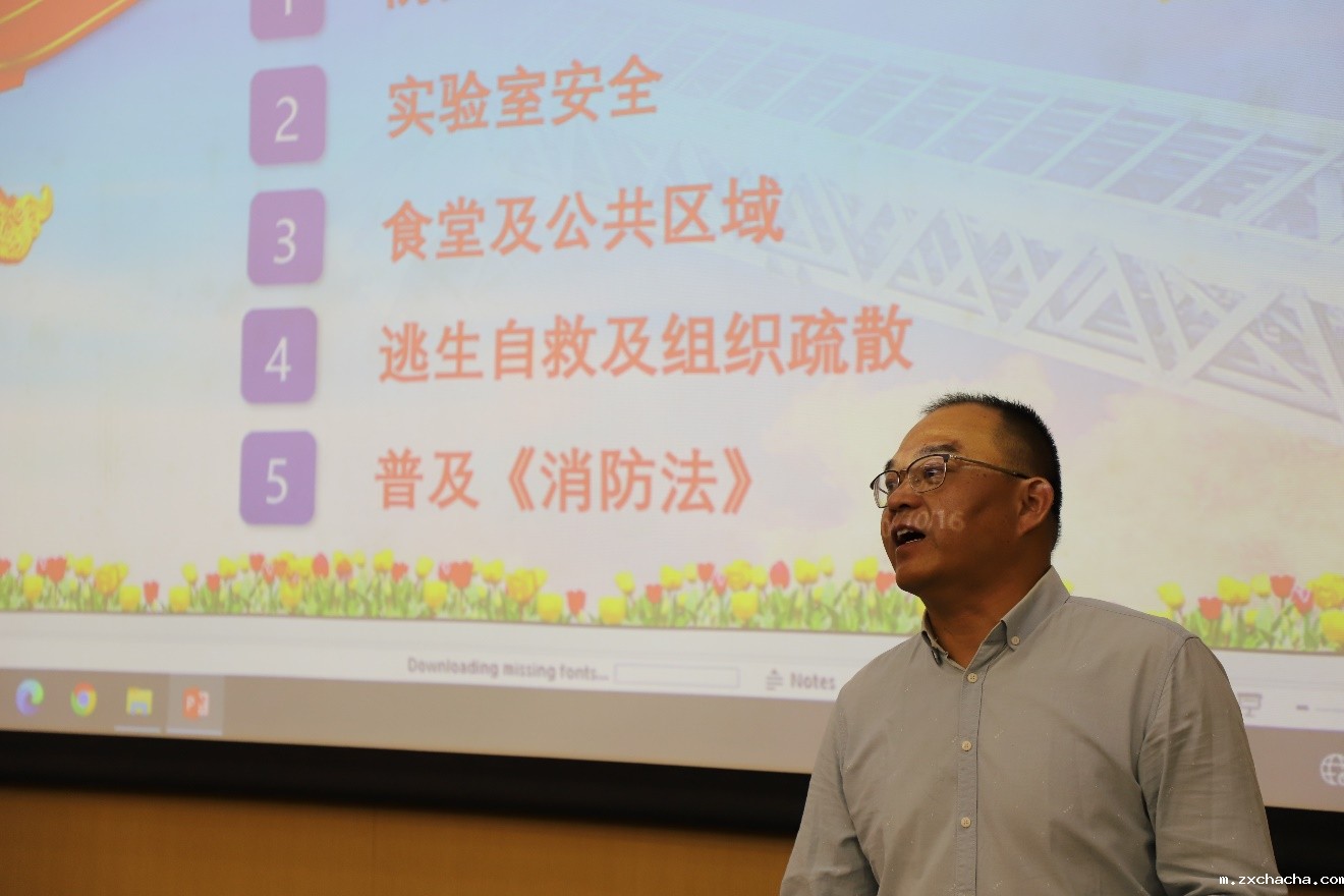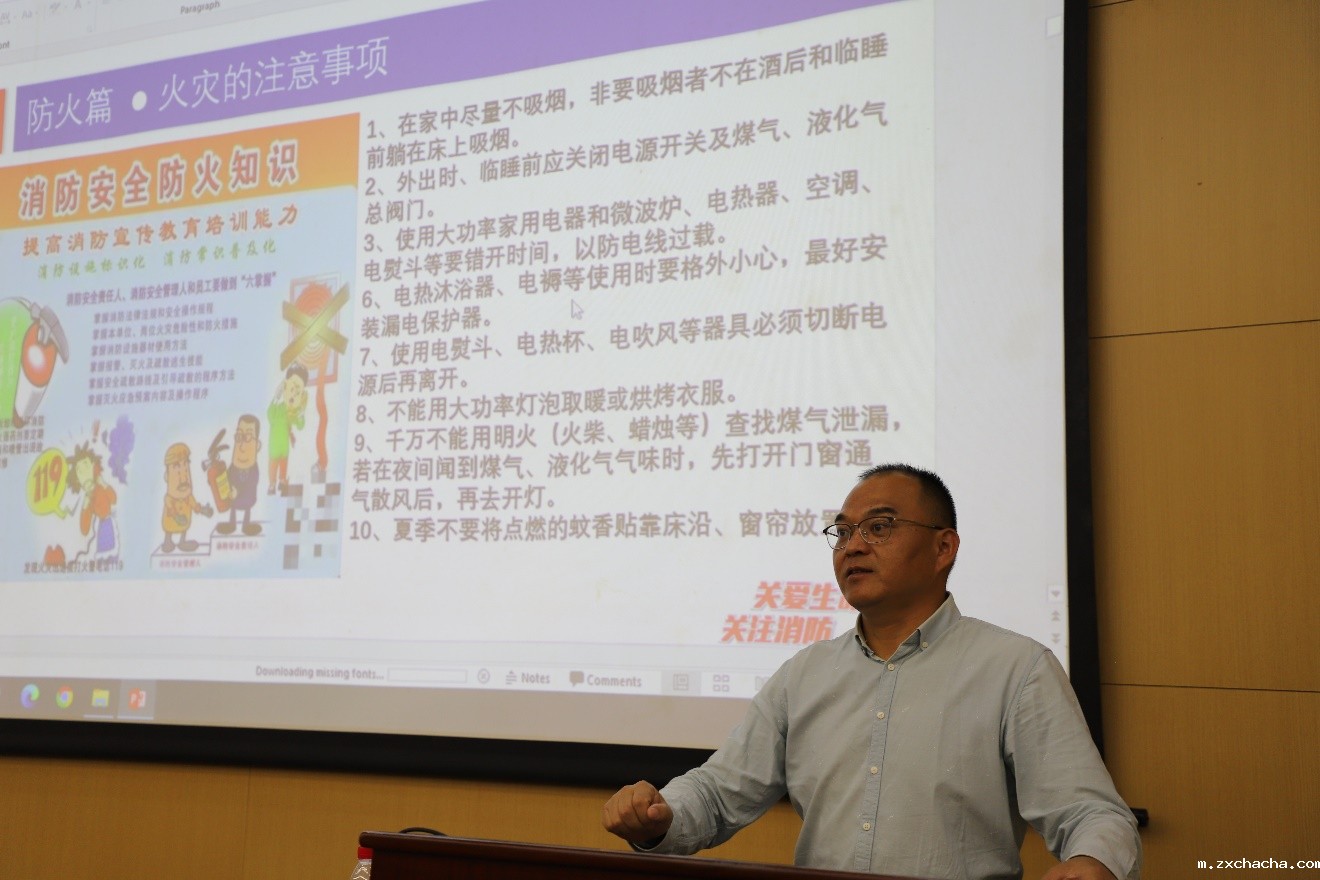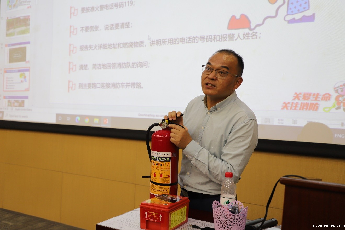在消防安全知识培训环节,他采用图文并茂的方式,向新生们介绍了安全生产法的相关条款和国内近期高发的重大火灾案例,对实验室的日常消防安全管理、火场疏散逃生等基本常识进行了深入浅出的讲解。
